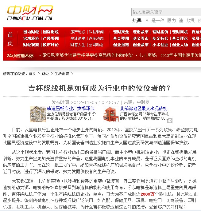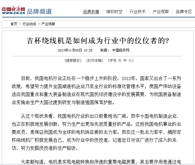 从这个现状来看,我国电机行业的出口前景相当广阔。而中小型电机制造企业,也正在积极地发展创新,努力生产出更加先进质量好的产品。这些我国电机事业的主要成员,是保证我国成为全球的电机供应商的主力军。而在这一批主力军中,揭阳吉杯绕线机厂积极发展自己,成为行业中的佼佼者。记者近日对该厂进行了深入的采访,努力发掘佼佼者的生产秘诀。